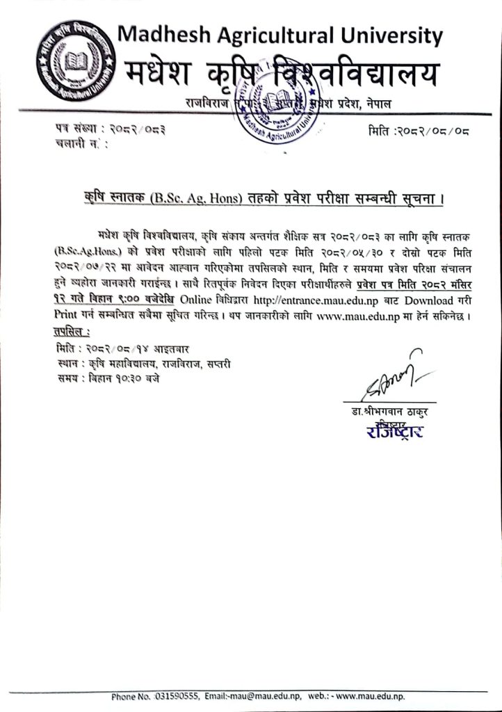 B. Sc. Ag. (Hons.) प्रवेश परीक्षा हुने सम्बन्धी सूचना